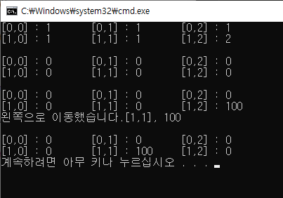Console.WriteLine("왼쪽으로 이동했습니다.[{0},{1}], {2}", this.rowIdx, this.colIdx, this.playerMap[this.rowIdx, this.colIdx]);