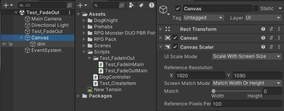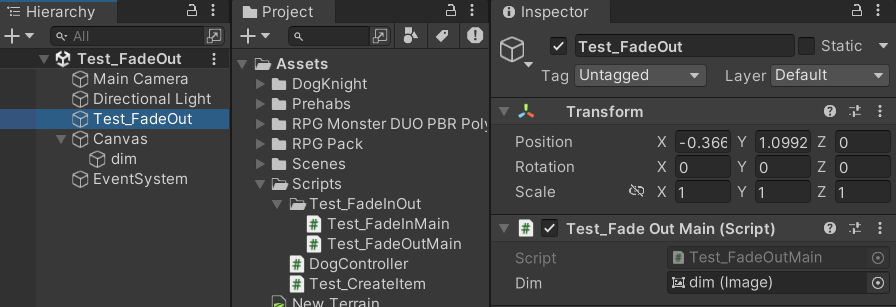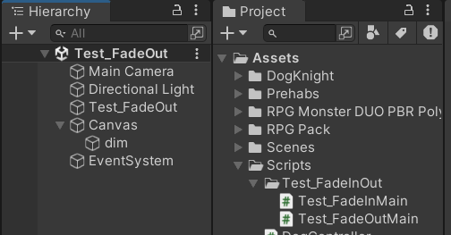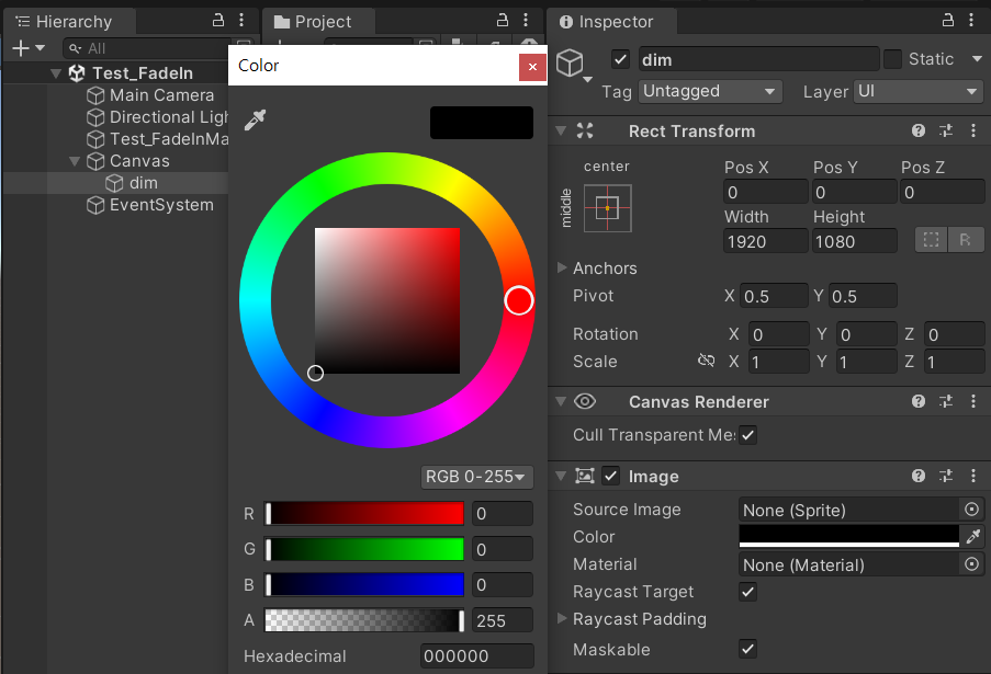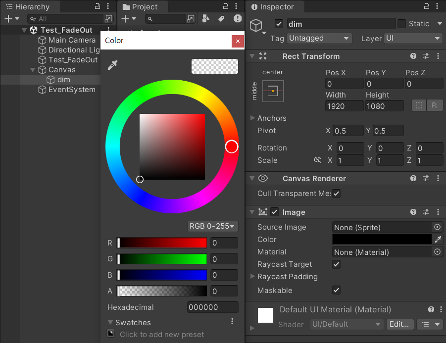 페이드 아웃 만들 때와 비슷하지만 dim 의 알파값을 0이 아니라 최대로 맞춰야함