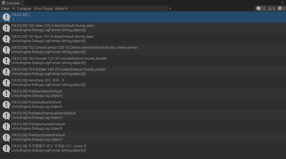 Debug.LogFormat("프리팹들이 로드 되었습니다. count: {0}", this.prefabs.Count);