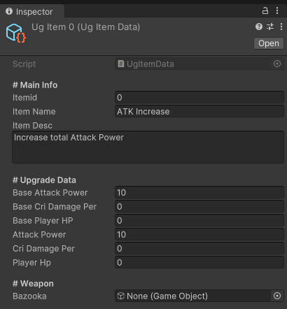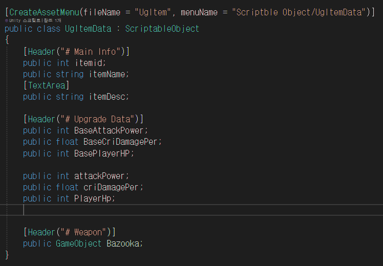 UgItemData.cs를 만들어 scriptble object로 데이터 저장